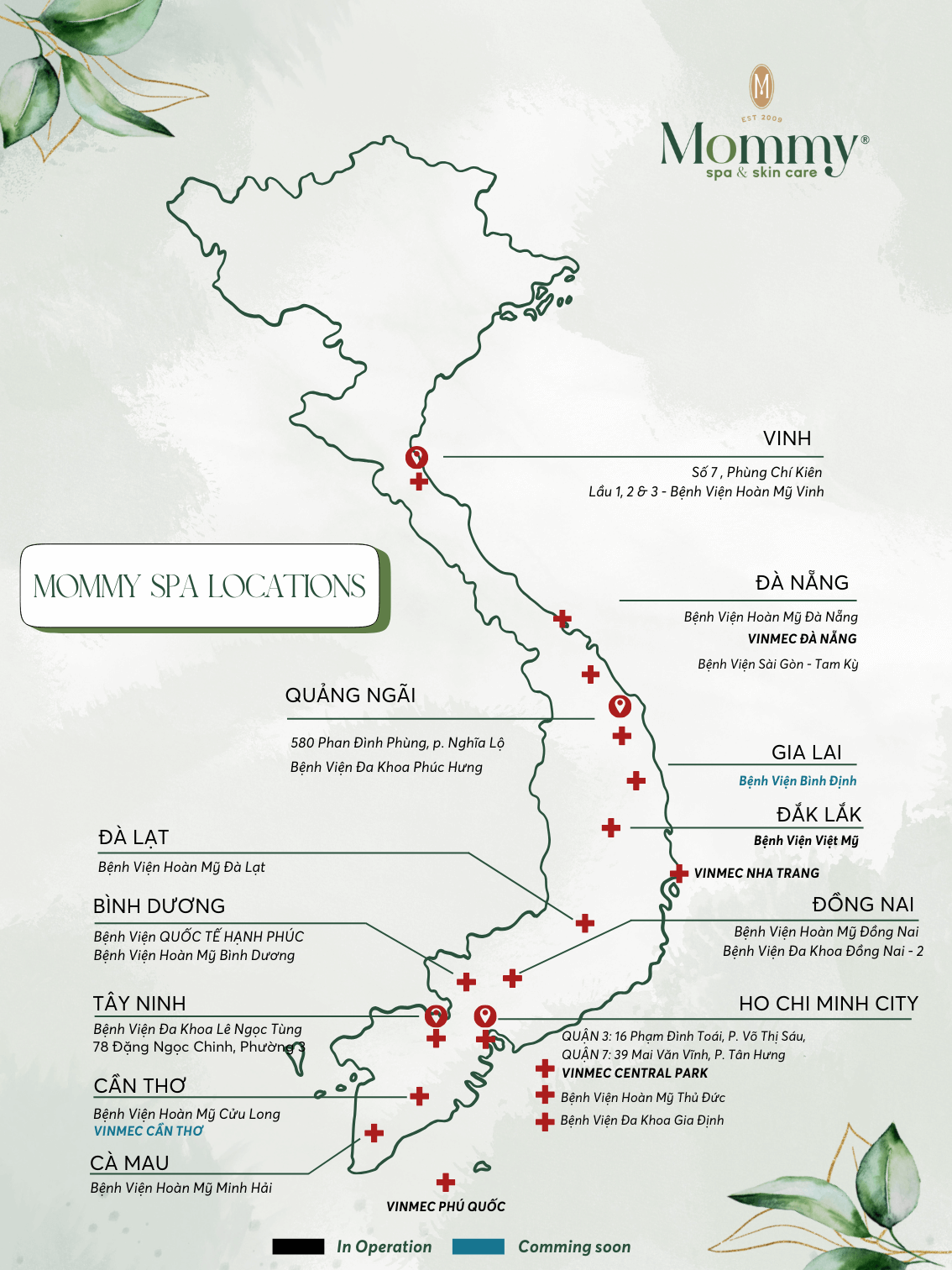 Trong đó, chúng tôi đã xây dựng thành công mạng lưới spa & skin care với 14 cơ sở nhượng quyền trải dài từ Bắc chí Nam, cung cấp dịch vụ vào các Bệnh Viện Sản Quốc Tế như Bệnh Viện Quốc Tế Hạnh Phúc, BV Quốc Tế Đồng Nai, BV Quốc Tế Vinh...